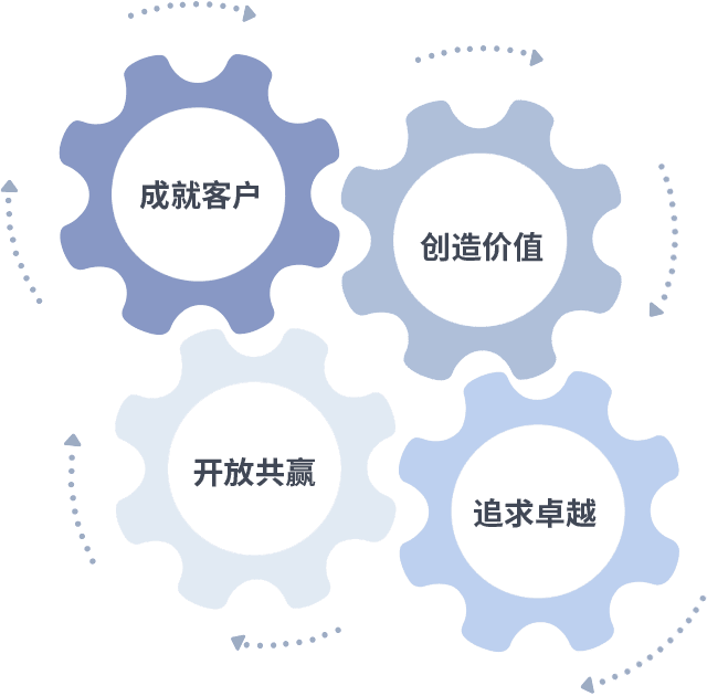 成就客户是一切决策的出发点,,,,创造价值是衡量所有工作的标准,,,追求卓越是我们做事做人的态度,,,,开放共赢是我们的格局也是最终的结果。。。价值观的齿轮环环相扣,,,,推动着组织里的每个人不断向前。。