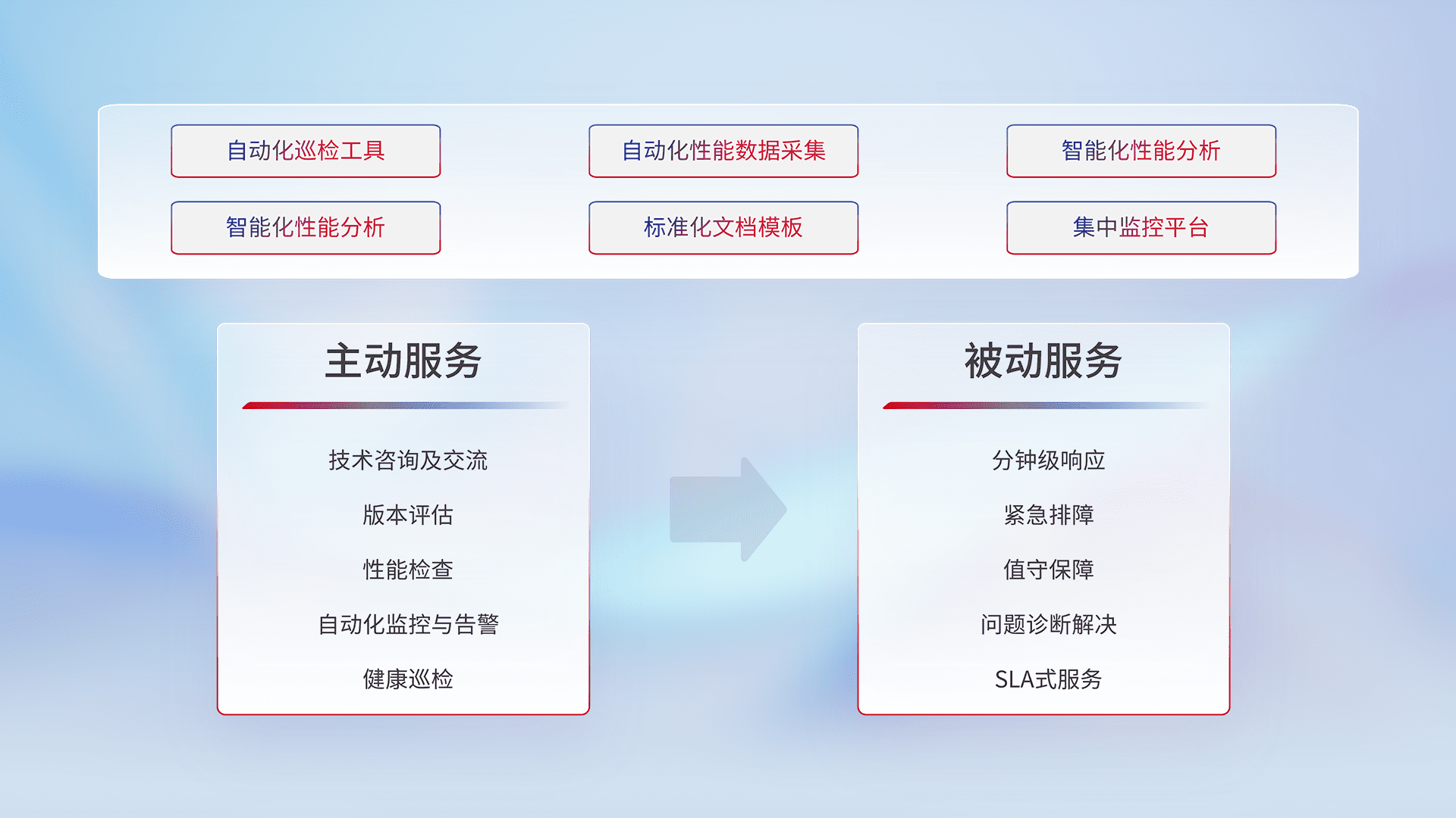 智能化工具和标准化文档,,保障服务质量,,提供主动服务(包含技术咨询、、版本评估、、性能检查、、自动化监控与告警、、、健康巡检)和被动服务包含(分钟级响应、、紧急排障、、值守保障、、、、问题诊断解决、、SLA服务)。。。