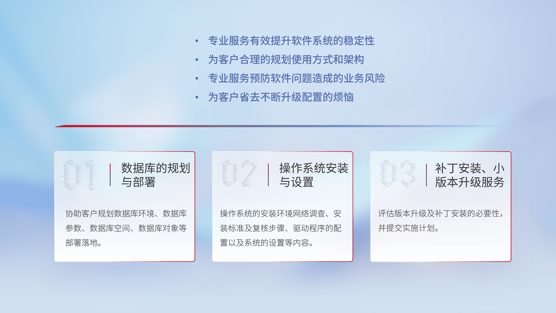 为客户提供软件规模升级、、、、快速部署、、按需配置的专业服务,,,,从数据库的规划与部署到操作系统的安装与设置,,再到补丁安装和小版本升级提供支持。。